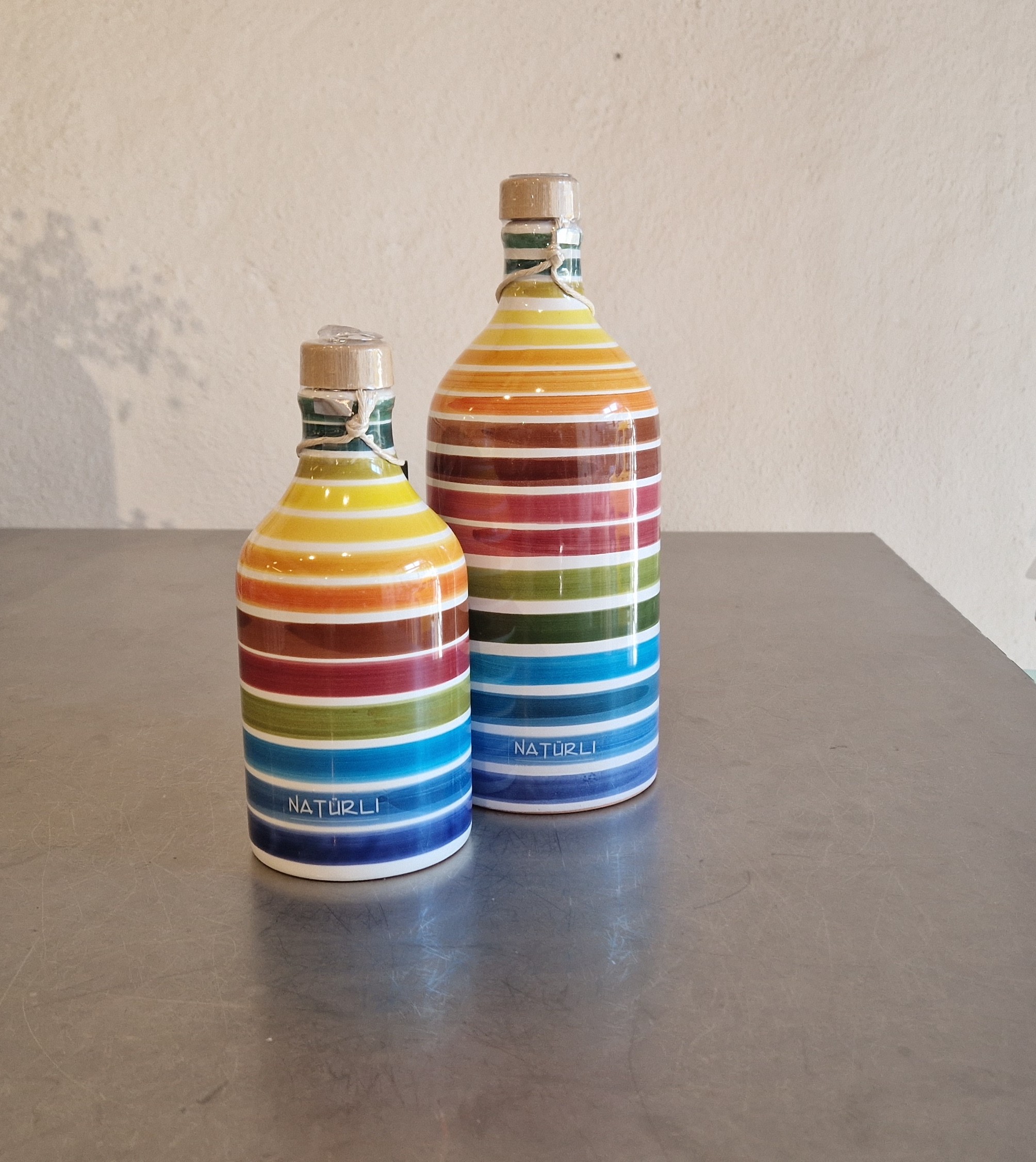 - Die Tonflasche „Arcobaleo“ wird ebenfalls in Apulien von Hand gefertigt und macht jede einzelne Flasche zu einem Unikat.